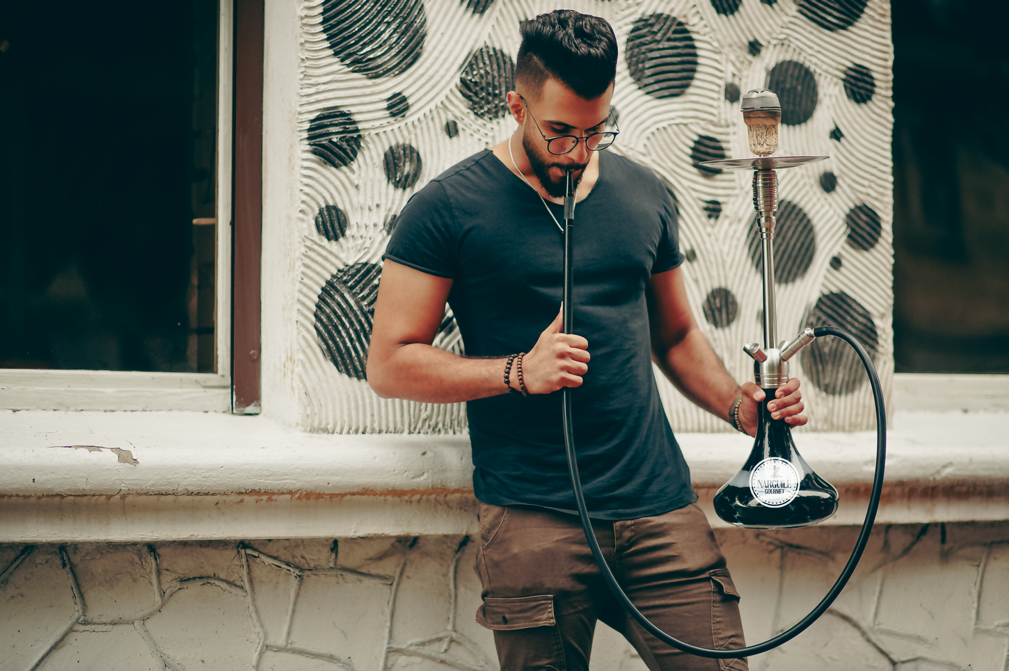 Em resumo, este logotipo é uma representação visual bem pensada que equilibra elementos clássicos e modernos, com uma paleta de cores sóbria e uma composição clara e concisa. Ele comunica efetivamente o conceito da marca, combinando a tradição do narguilé com a sofisticação da experiência gourmet, buscando atrair um público que valoriza a qualidade, a exclusividade e a atenção aos detalhes.